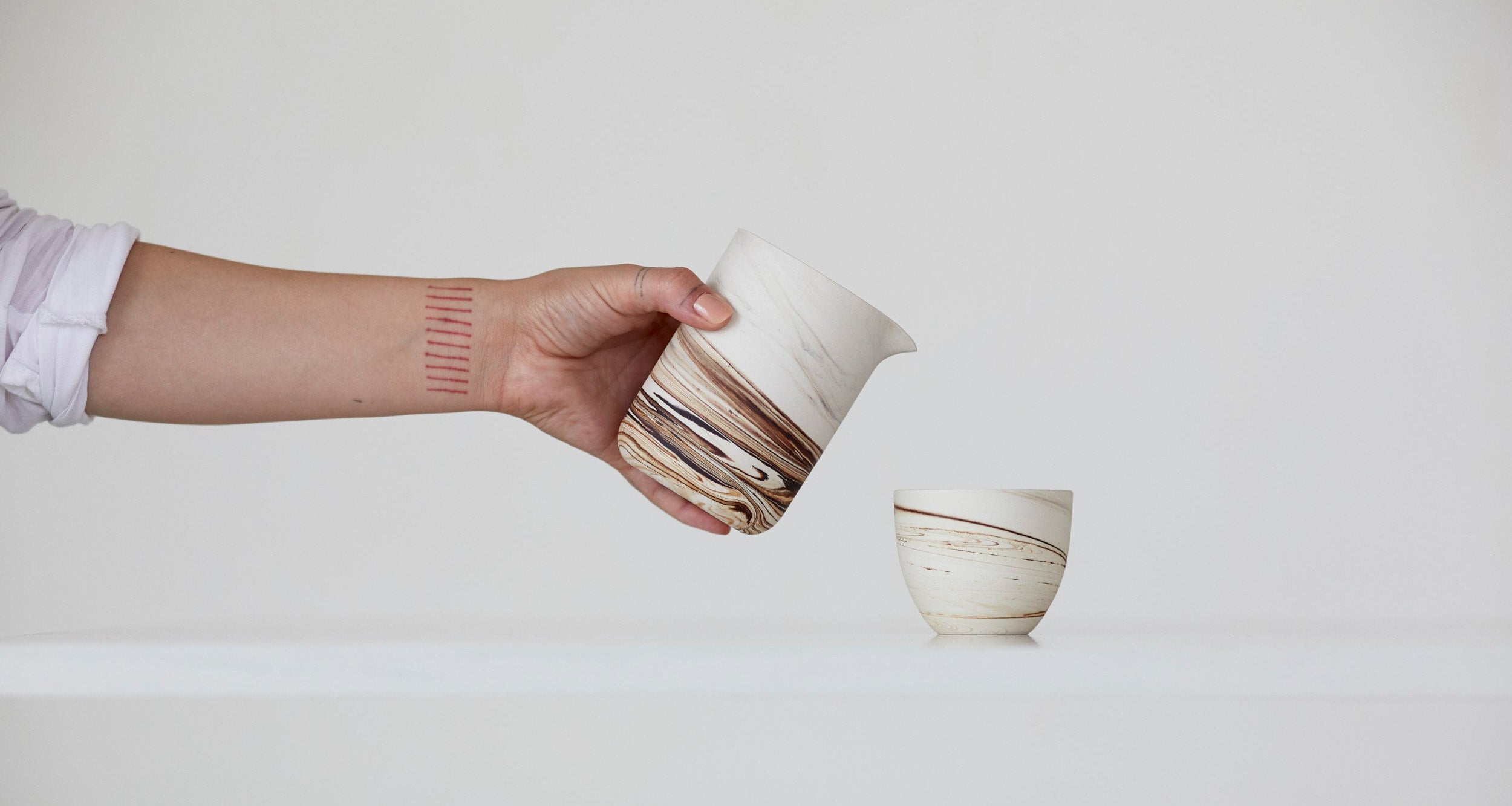 Japonská kaligrafická technika, která pomáhá zklidnit mysl a umožňuje soustředění pouze na daný okamžik. Jako médium je zde použitý porcelán, každý šálek je trochu jiný, ale všechny mají za cíl upomínat shodo filosofii při každodenním užívání.